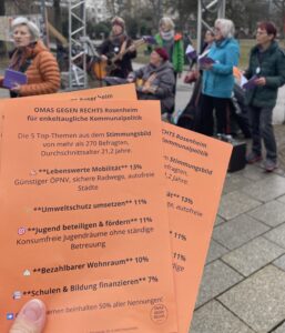 14 engagierte Frauen aus unserer Gruppe, 4 Kilometer, 500 verteilte Wahlpostkarten für Demokratie und Menschenrechte sowie jede Menge Buttons „JUGEND GEGEN RECHTS“ und „OMAS GEGEN RECHTS Rosenheim“. An fünf Plätzen haben wir unsere selbst getexteten Lieder gesungen und mit vielen Menschen gesprochen.